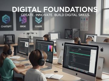 The foundations course introduces middle and high school students to a full creative toolkit — including: ChatGPT/Gemini/Claude, Canva, Final Cut Pro, Suno, DJI drones and 3d printers — while building critical digital skills like touch typing, computer proficiency, file management, and prompt/context engineering skills.