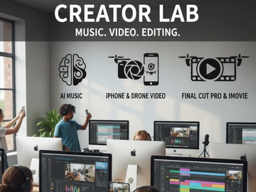 Learn the tools creators are using today. In this hands-on after-school lab, students make original music with AI audio generators, shoot videos on iPhones and DJI drones and learn to put it all together in Final Cut Pro and iMovie. Each week stacks and blends new creative tools while learning real production skills.